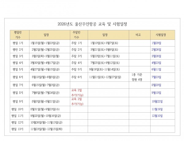 26년도 울산무인항공 교육 및 시험 일정 페이지 정보 작성자 울산무인항공 댓글 0건 조회 449회 작성일 25-12-31 13:15 본문 첨부파일 2026년도 울산무인항공 교육일정.hwp (26.5K) 6회 다운로드 | DATE : 2026-01-08 12:44:22 목록 다음글2026년도 초경량비행장치 조종자 증명 시험 시행계획 공고 25.12.19 댓글목록 댓글목록 등록된 댓글이 없습니다.
